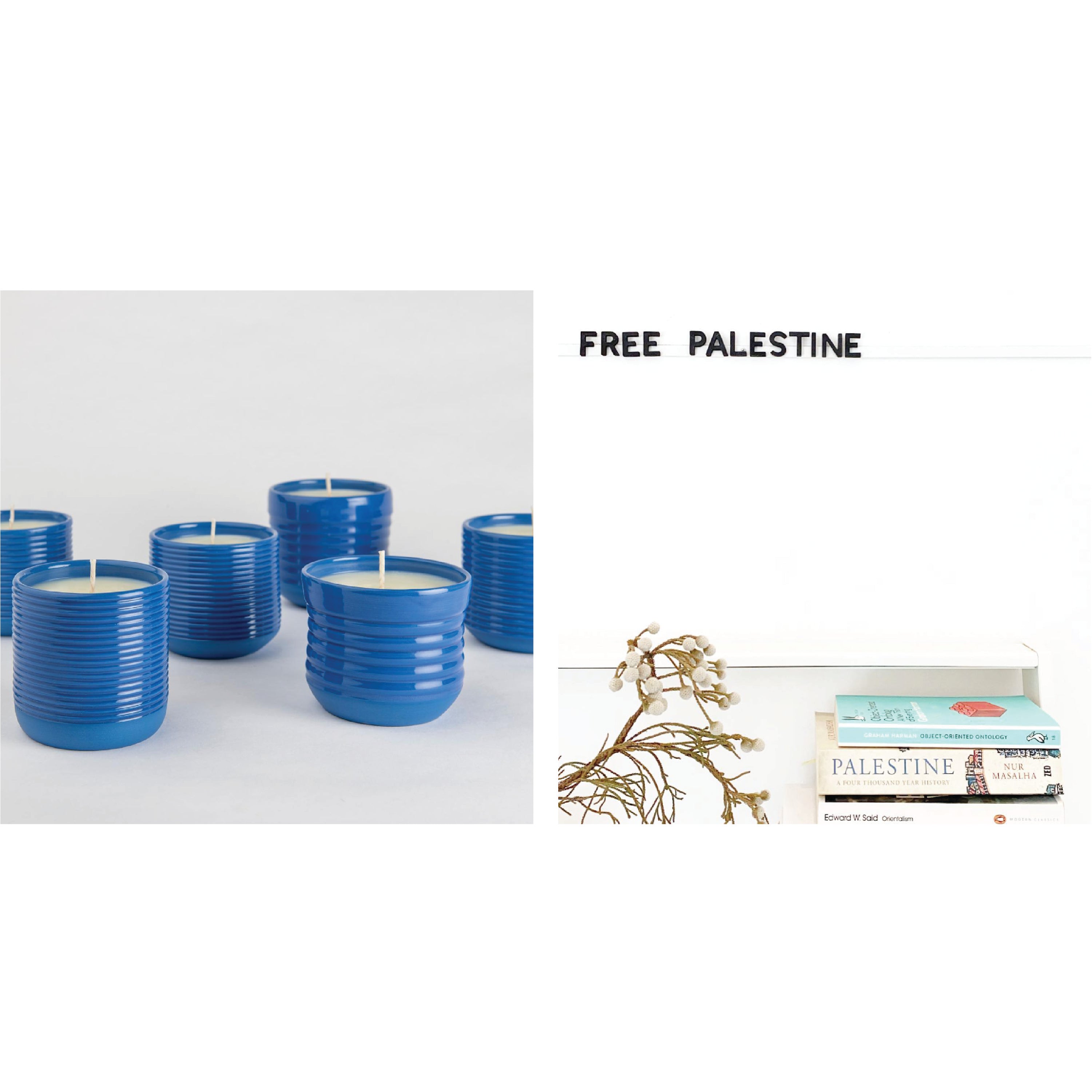We associate this blue with Palestine and specifically with Yaffa. The scent of these candles reference Yaffa’s orange trees